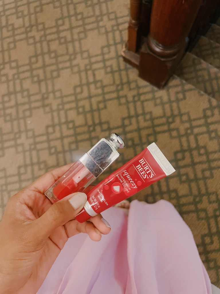 For these flowers I used an exquisite vase that was my grandmother’s. It is shorter in size than a usual vase, but also a bit wider. This helped create a more dimensional look with these flowers. I’m also sharing below the recent lip duo I’ve been using (pink inspired): my Dior Lip Oil and Burts Bees Tinted Balm for a bit of color with long-lasting shine. I usually love Burts Bees products but if I’m being honest, this balm didn’t drive me too crazy. I found that the color would last for a very short time.